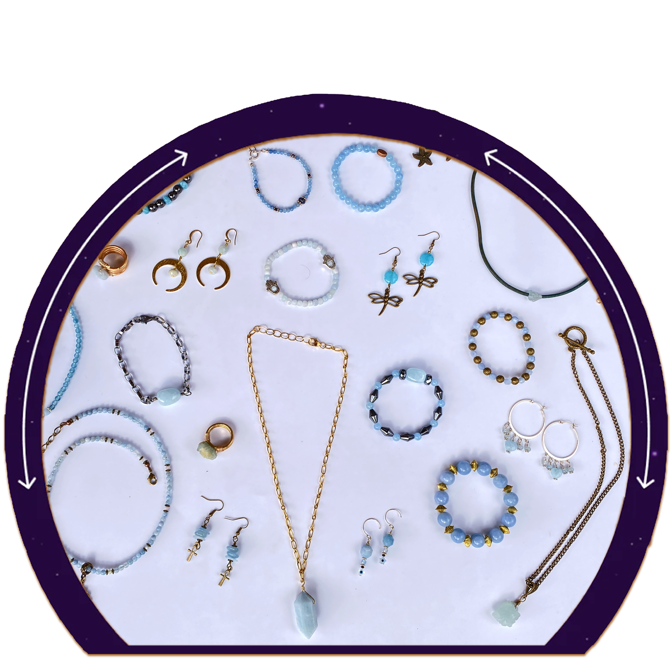Genuine Gemstone Jewelry for women including beaded Bracelets & Necklaces, Stud and Drop Earrings as well as Anklets. Also Copper, Brass or Silver Chain necklaces with Gemstone Pendants along with Leather Integrated bracelets and necklaces. As well as Handmade rings and gemstone accessories.