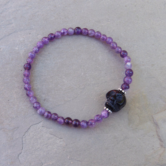 Amethyst gemstone, Onyx Skull, and Sterling Silver Women’s Stertch Bracelet