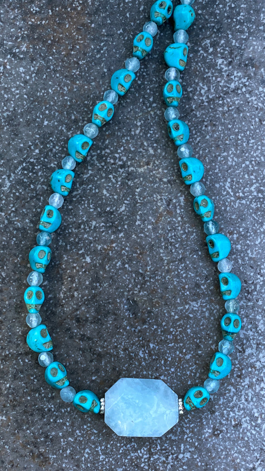 Aquamarine and Howlite Skull Necklace