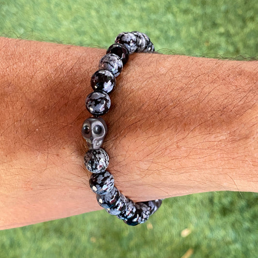 Snowflake Obsidian and Hematite Skull Bracelet