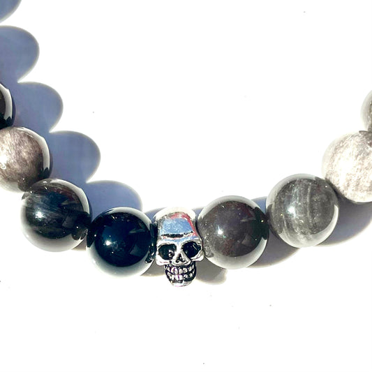 Silver Obsidian and Sterling Silver Skull Bracelet