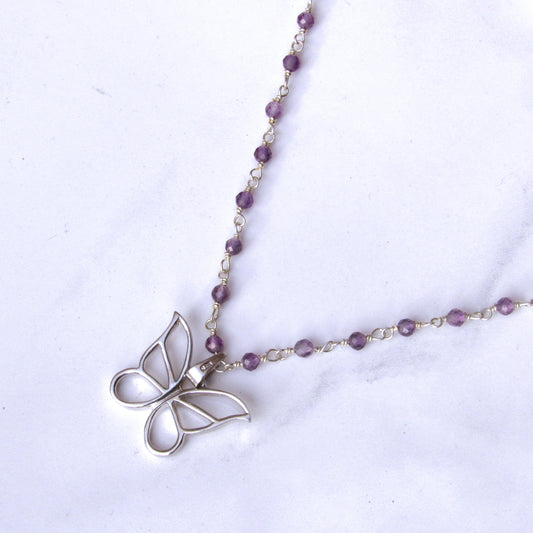 Sterling Silver Wrapped Amethyst gemstone Beads with Sterling Silver Butterfly Pendant