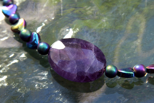 Rainbow Hematite and Amethyst gemstone choker necklace