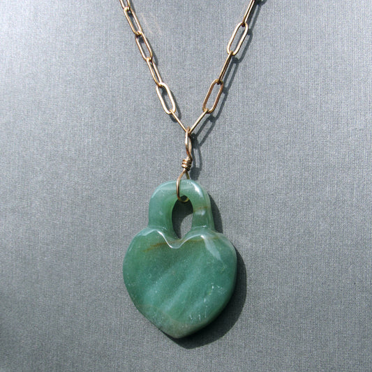 Green Aventurine gemstone carved Heart Lock on Brass Chain