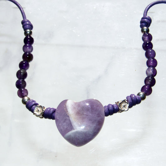 Amethyst gemstone and heart with sterling silver on leather necklace