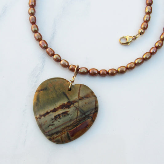 Picasso Jasper gemstone Heart on genuine Pearls necklace