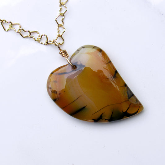 Dragon’s Vein Agate gemstone heart on gold heart chain necklace