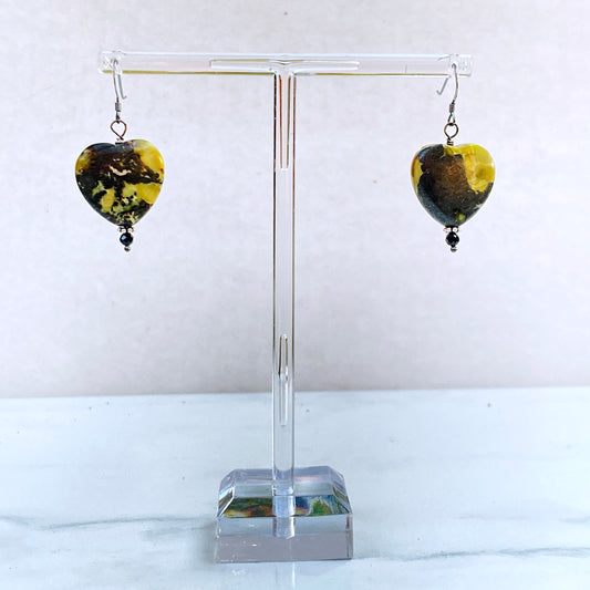 Yellow Turquoise Gemstone Hearts and Oxidized Sterling Silver Drop Earrings