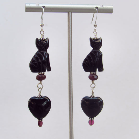 Onyx gemstone Cats and Hearts, Garnets & Sterling Silver Earrings