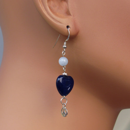 Blue Agate gemstone Hearts, Sterling Silver Peace Signs, Aquamarine, Sterling Silver Drop Earrings