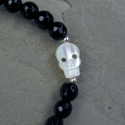 Onyx, Mother of Pearl, and Sterling Silver Skull Stretch Bracelet