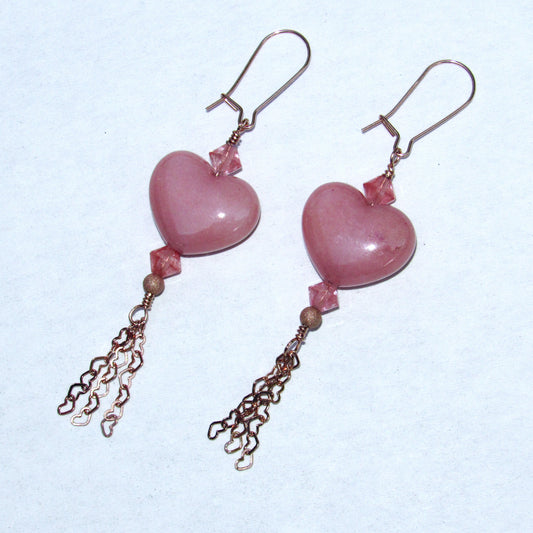 Pink Jade gemstone Hearts, Cherry Quartz, 18 Kt Gold Vermeil Heart Chain Hand wrapped Drop Earrings