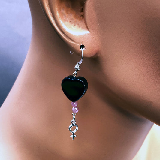 Black Onyx hearts and Pink Tourmaline with Sterling Silver Drop Earrings