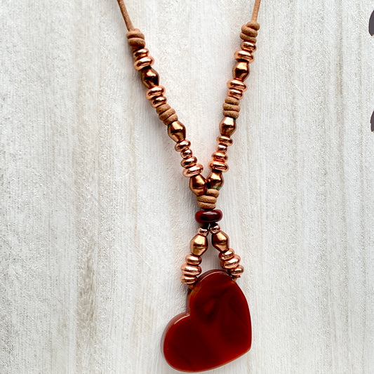 Red Agate gemstone Heart, Red Jasper, and Copper Boho Leather Necklace
