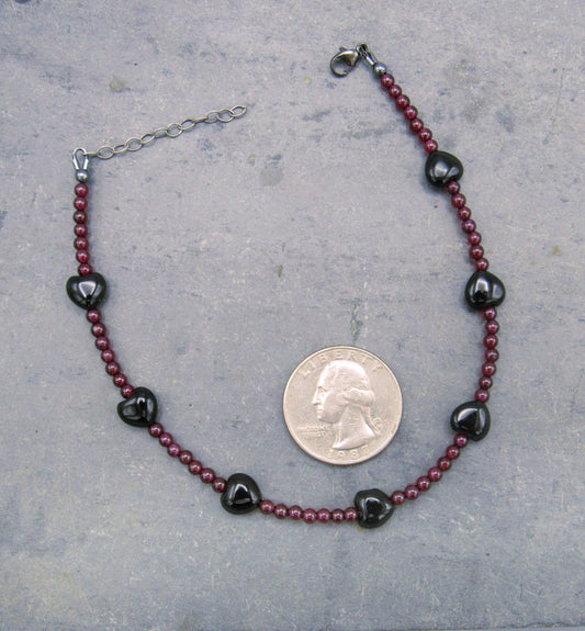 Garnet gemstones and Onyx Hearts Anklet with Oxidized Sterling