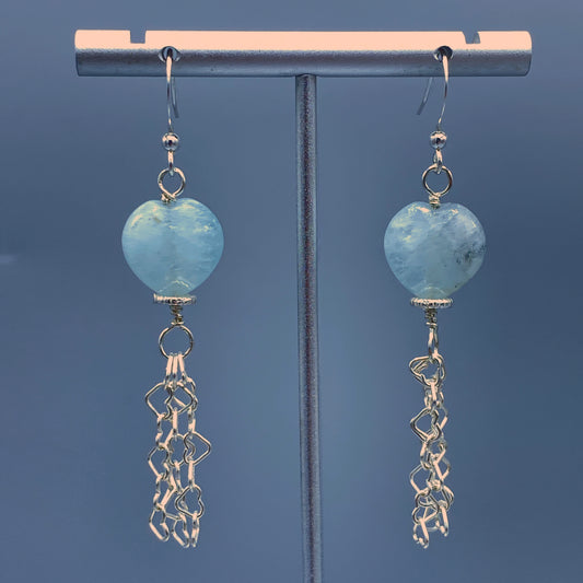 Aquamarine Gemstone Hearts with Sterling Silver Heart Chain Drop Earrings