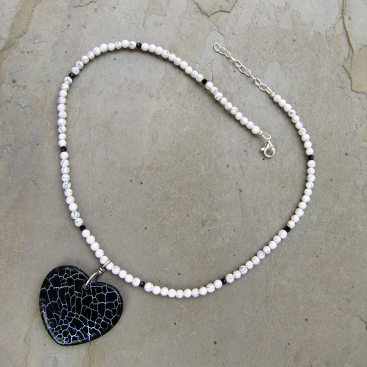 Dragon’s Vein Agate Heart on White Turquoise with Black Spinel and Sterling Silver