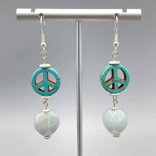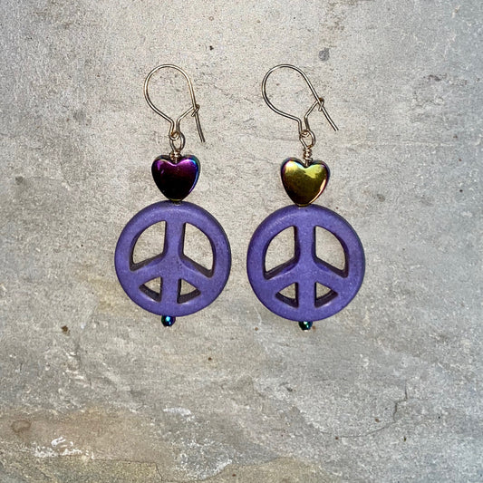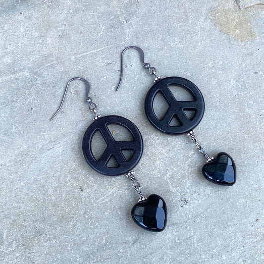 Howlite Peace Sign and Hematite gemstone Heart drop Earrings
