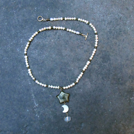 Pyrite Star, Mother of Pearl Moon, Clear Quartz Heart gemstone Necklace
