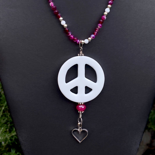 White Agate Peace Sign W/ Pink Banded Agate Sterling Silver Heart & Chalcedony