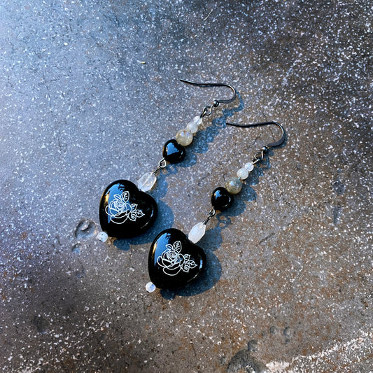 Hand Painted Onyx Heart, Moonstones, and Labradorite Drop Earrings with Sterling Silver