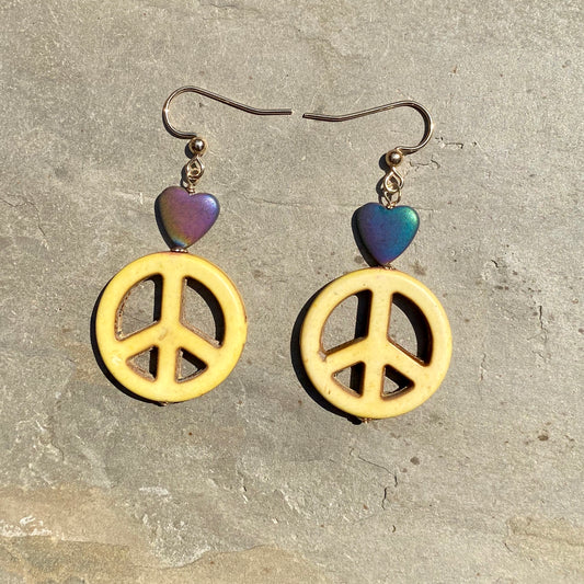 Howlite Peace Sign w/ Hematite Heart Drop Earrings in Choice of colors