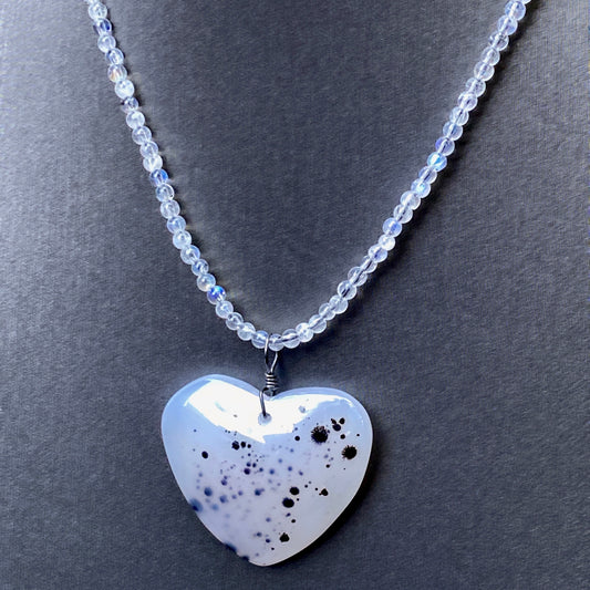 Scenic Dendritic Agate Heart Pendant on Moonstones and Oxidized Sterling Silver