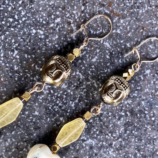 yellow Agate hearts, Hematite Buddha, yellow Calcite Gemstone earrings