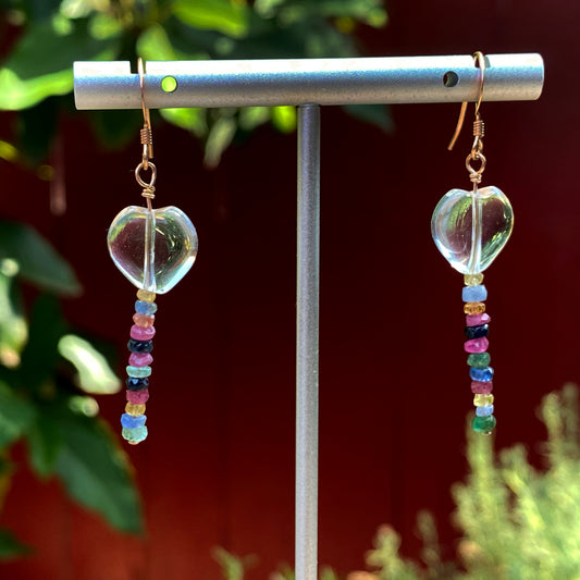 Clear Quartz hearts with precious stones Emeralds, Rubies, Sapphires drop earrings