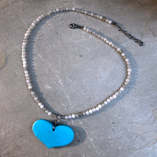 Sterling silver with freshwater pearls, painted onyx pendant, white topaz, hanging heart chain