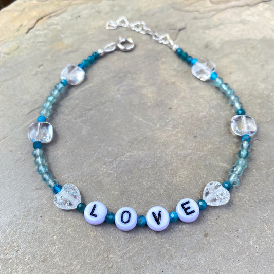 Blue Apatite “LOVE” anklet with Clear Quartz Gemstone heart beads