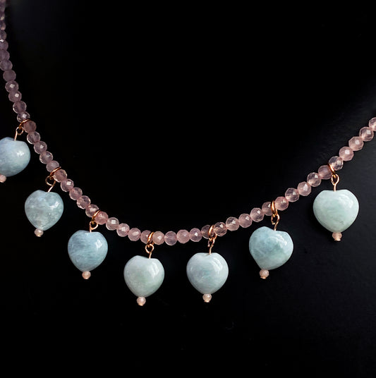 Aquamarine Hearts and Rose Quartz Gemstone with 14 kt rose gold fill Necklace