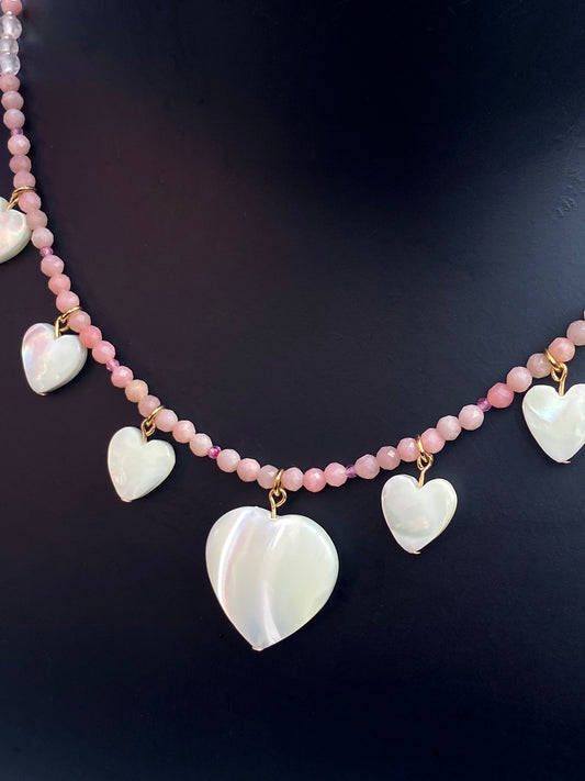 Women’s Mother of Pearl Hearts with Rose Quartz, pink Topaz, and pink Opals