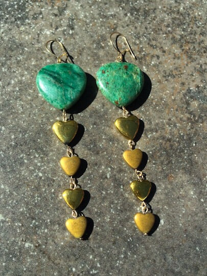 Green Jasper & gold Hematite Hearts long drop Earrings
