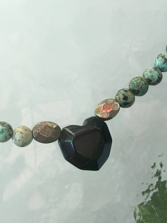 Striped Onyx heart pendant on beaded Moonstone & Clear Quartz Gemstone necklace