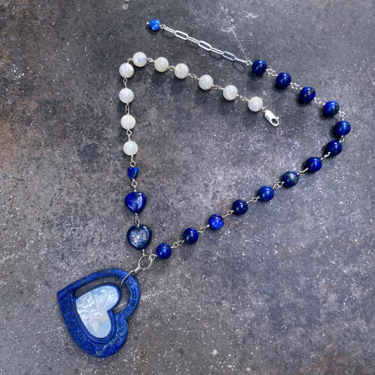 Lapis Lazuli gemstone and Mother of Pearl Heart Cupid Pendant Necklace