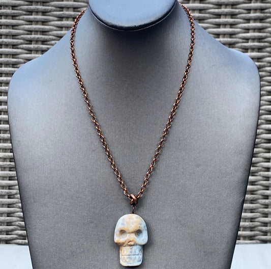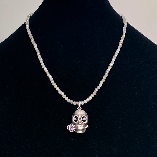 White Labradorite gemstone and Skull with Rose pendant Necklace