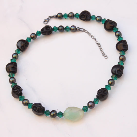 Howlite Skulls, Freshwater Pearls, Swarovski Crystals, And Chalcedony Focal Choker