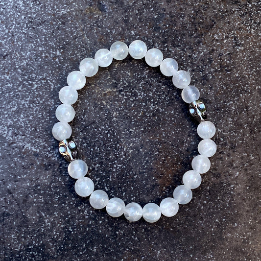 Selenite gemstone and Hematite Skull Men’s Stretch Bracelet