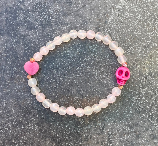 Pink Agate, pink Jade gemstone, and Howlite Skull bracelet