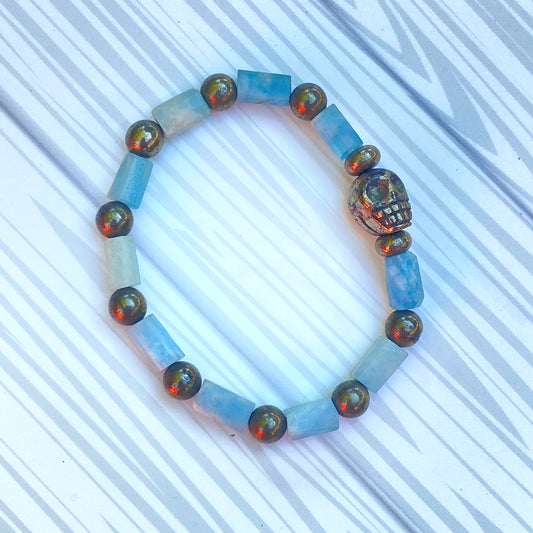 Aquamarine and Pyrite gemstone Skull Beaded Stretch Bracelet