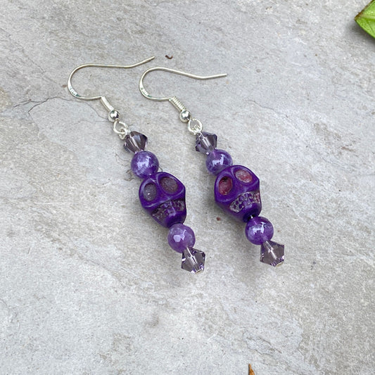 Purple Howlite Skull. Amethyst Gemstones & Swarovski Crystal Earrings
