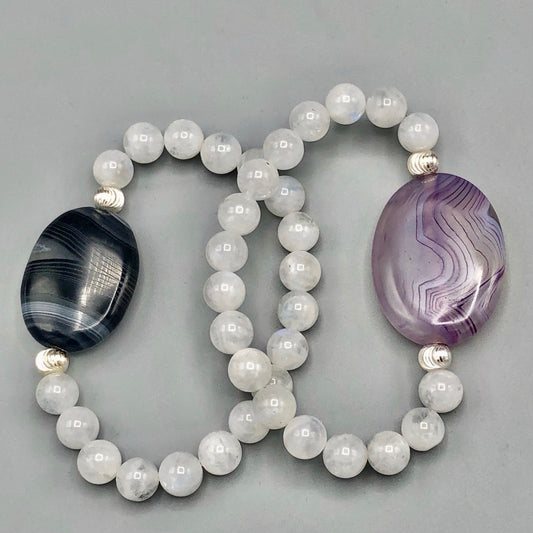 Purple Banded Agate with Moonstones and Sterling Silver Women’s Chunky Stretch Bracelet