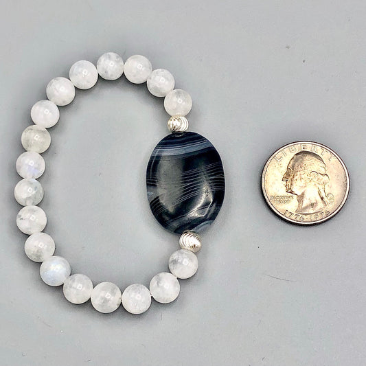 Black Striped Agate, Sterling Silver, and Moonstones Women’s Stretch Bracelet