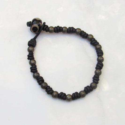 Leather Hand Knotted Pyrite and Tibetan Agate Bracelet
