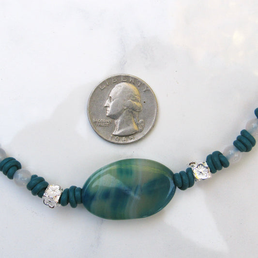 Blue band agate & White Agate gemstones hand knotted leather necklace