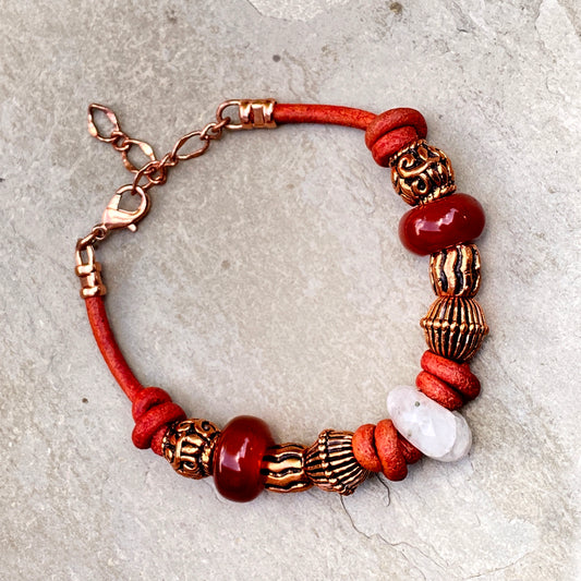 Moonstone gemstone with Red Agate and Copper on Red Leather clasp Bracelet