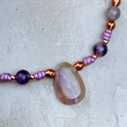 Rose Quartz gemstone heart and Copper on Natural Leather