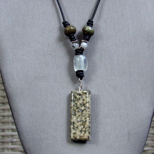 Ocean Jasper Gemstone and Quartz with Sterling Silver on Black Leather Necklace