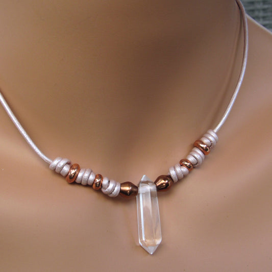 Clear Quartz gemstone and Copper on Metallic Pink Leather Necklace